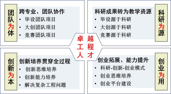 为此,学院以复合型、创新型卓越工程人才培养为目标,提出了“融合、共享、创新”的改革理念。经过10年探索,构建了“专业融合、资源融合、教师融合”的“3融”保障体系,探索出了“团队为体、科研为源、创新为本、创业为用”的“4为”培养模式,形成了大机械类卓越工程人才“3融4为”培养体系。