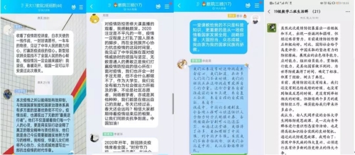 数学学院学生以班级为单位,在微信群中展开了热烈的讨论。学生们在讨论后的心得中写到“在这场疫情面前,不管是组建青年突击队,还是招募志愿者,都能看到我们同龄人勇敢逆行的身影,我们这一代人有那股不畏不惧的韧劲,我们未来一定是祖国建设的强大力量!”“在这个特殊时刻,我们14亿中国人万众一心、众志成城,创造了一系列“中国速度”和“中国奇迹”,充分显示了我国社会主义制度的优越性,让全世界见识到了我们国家强大的凝聚力。‘没有一个冬天不可逾越,没有一个春天不会来临。’我相信,在党和国家的领导下,我们一定能够取得这场战“疫”的最终胜利。