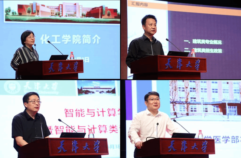 会上,化工学院、建筑学院、智能与计算学部、医学部分别从学院学科和招生专业的视角,做了关于学院学科实力、特色优势、师资力量和学生发展的主题报告。化工学院副院长夏淑倩在报告中指出,天津大学化工学院在国内首屈一指,学科国际位列前三甲。建筑学院副院长许蓁在报告中指出,建筑学院是国内著名的建筑院校老四校之一,建院至今培养了工程院院士崔恺、梁思成奖获得者周恺和奥运鸟巢中方设计师李兴刚等一大批行业领军人物。智能与计算学部副主任王建荣在报告中指出,智能与计算相关学科是未来智慧社会的核心,学生就业率连续5年达到99%以上。医学部执行主任明东在报告中指出,天津大学医学部目标是培养高水平复合型医学领军人才,培养面向未来的“大医生”。