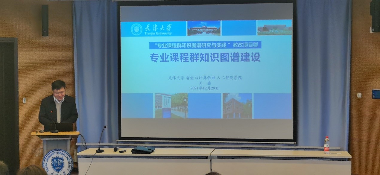 智能与计算学部王鑫教授聚焦人工智能教学资源建设和加强课程体系系统化设计,分享了专业课程群知识图谱研究与实践工作进展,从项目背景、建设思路、研究成效、后期规划等方面进行了详细介绍,重点介绍并演示了智能与计算学部专业课程群知识图谱可视化系统。