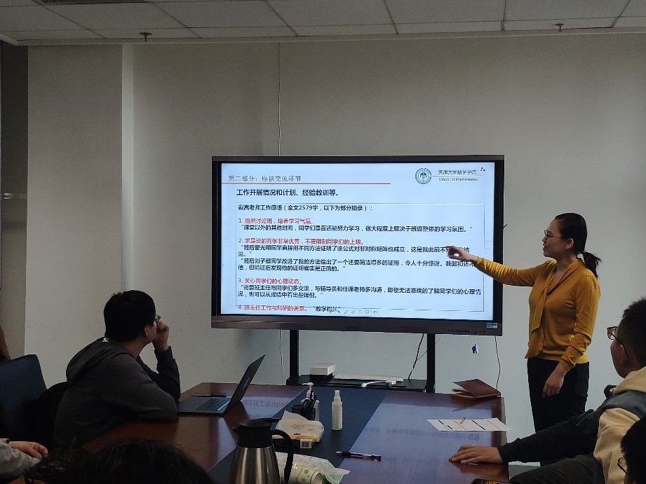 本站讯(通讯员 唐婧亚)为进一步推进学院“三全育人”“五育并举”人才培养综合改革,11月12日下午,数学学院召开班主任、书院导师工作沙龙。党委书记马德刚、副书记许晶、学院教务员、辅导员与本科生班主任、书院导师一道共话数学人才培养。