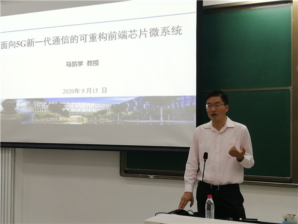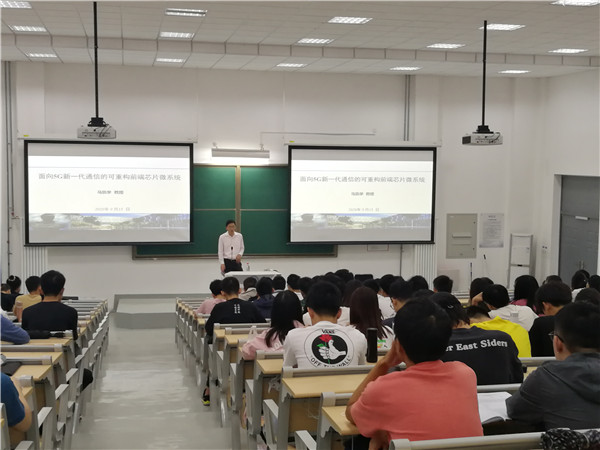 院长马凯学教授以《面向5G新一代通信的可重构前端芯片微系统》为题为同学们解读行业领域的现状与机遇。他首先从移动通信发展趋势切入,详细解读了5G无线通信的要求。他提到,大规模的数据流量,已经推动5G成为行业热点。随后,马院长针对射频前端的技术挑战以及前端电路与系统的机遇进行讲解,他认为,5G高速通信系统对于天线、射频电路、模数混合电路以及芯片的性能、封装、测试都提出了更高的要求,这既是挑战也是机会。