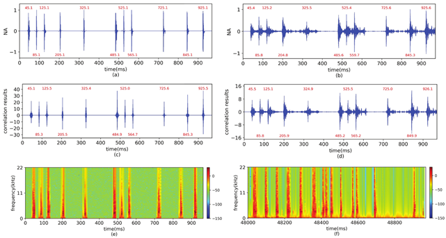 (a)-(d)仿生伪装通信帧及其处理过程, (e)仿生伪装通信帧时频图, (f)真实的鲸叫声串时频图