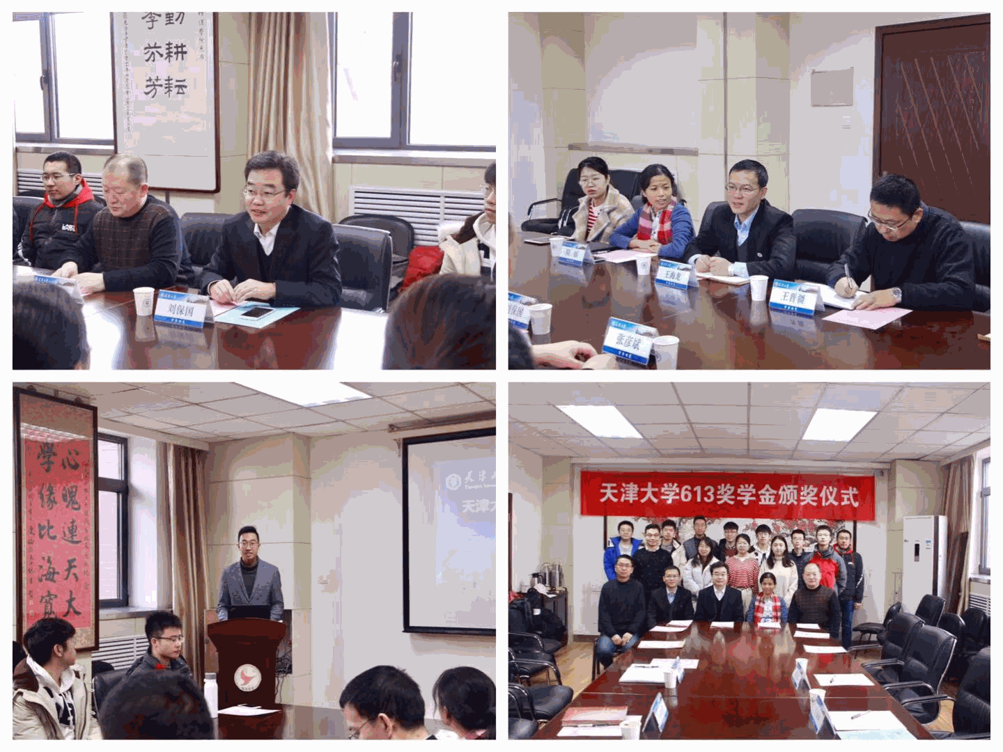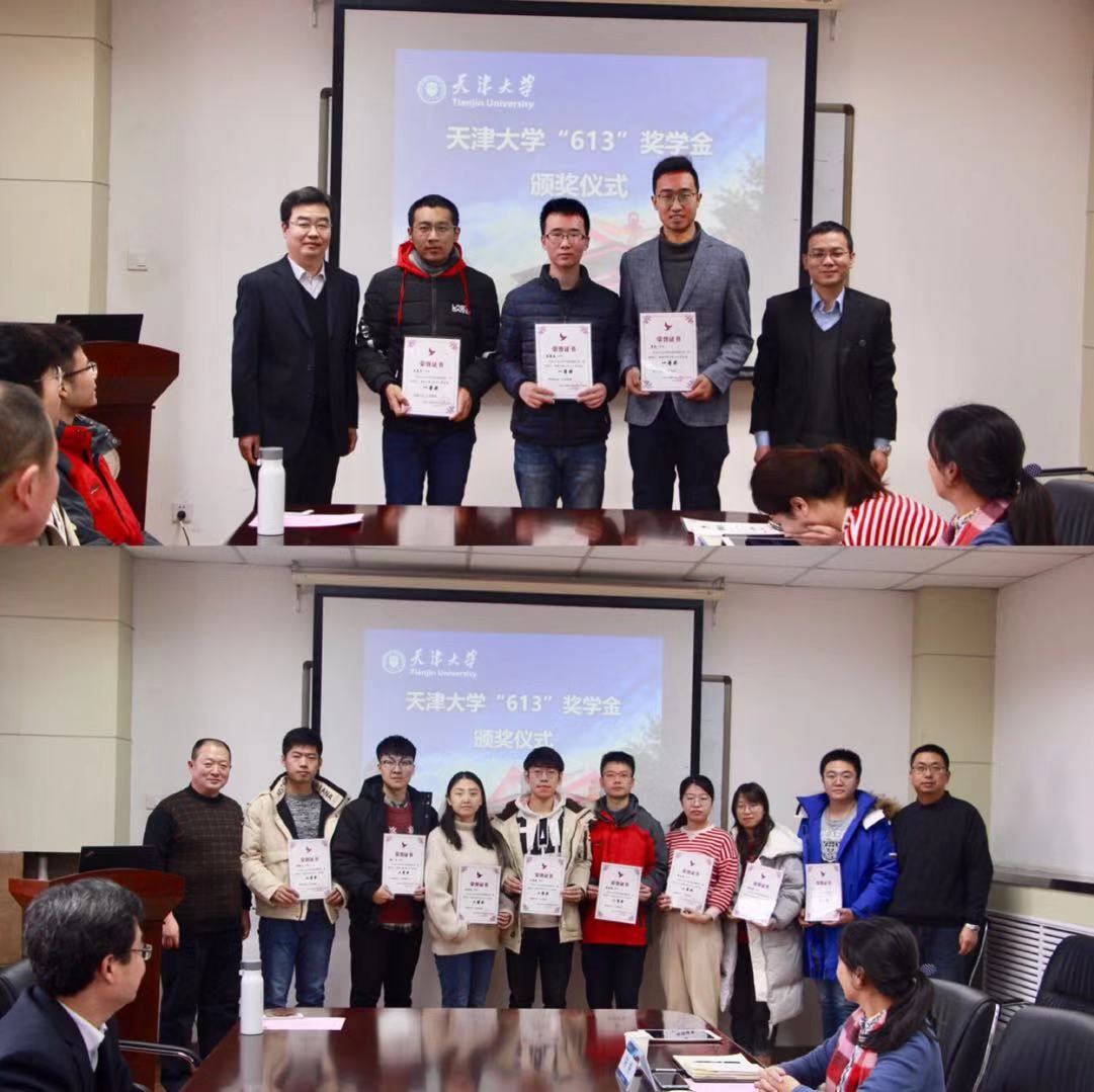 中航工业光电所自2016年起每年提供15万元支持精仪学院学生科技创新活动,并设立天津大学“613奖学金”,用以奖励在科技创新活动中具有创新精神和实践能力的优秀学生。2017-2018学年共有15人获得该奖学金,其中一等奖5人、二等奖10人。刘保国、王海龙、张彦斌、王晋疆分别为获奖同学颁奖。
