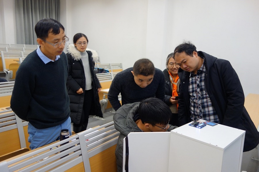 经过前期的设计、制造、组装和试验,所有组的成品皆已具备完整的实际功能。展示分为演讲汇报、实物演示和提问答辩三个环节。同学们的选题从智慧起居到节能出行、从全民大众到助残公益、从便捷医疗到紧急救护,不仅构思巧妙且结合实际,制造出了很多让人眼前一亮的智能装置,吸引评审嘉宾每每起身近距离观摩、尝试操作。其中第3组的“智能导盲手杖”利用超声波传感器探测障碍物,根据距离远近通过手柄震动频率提示主人躲避障碍物,并具有灯光求助功能。不仅设计功能完整,且具有公益性质的社会意义。据组员介绍,下一步将改进手杖的底盘装置,以实现更多地面状况的智能导盲。