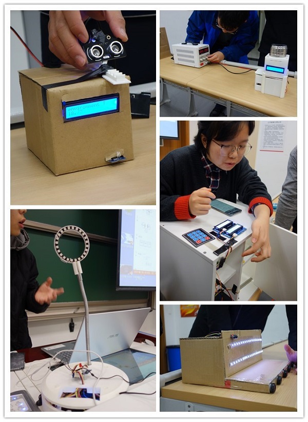 作为“未来智能机器与系统”平台的项目式课程之一,《智能电子创客设计与实践》课程考虑以移动计算为特征的后PC时代技术发展,按功能而非学科组织教学内容,打破机械、电子、软件、硬件等课程界限,重新整合为Capture、Control、Compute、Communication四个功能性主题。每个主题都涵盖与之相关的机、电、编程相关知识,给学生“一揽子”解决方案,使学生掌握解决工程实际问题的能力。课程分为单片机程序设计、手机APP开发、传感器与执行器应用、3D打印、蓝牙通信等五个模块,课程涉及多学科知识和内容,师资团队的7位教师分别来自机械学院、自动化学院、精仪学院、微电子学院和智算学部。本课程提出了面向创客电子教学的“6P法”,采用项目式教学方式,题目由学生自己构思,通过各种先进的智能电子装置“逆向”激发学生的创意,极大促进了学生对先进知识的求知欲和创新潜力。刚入学几个月的大一新生,综合利用此课程的学习成果,将互不相同的创意项目变成了现实装置,实现了本课程“从无到有的创客造物”能力培养目标。