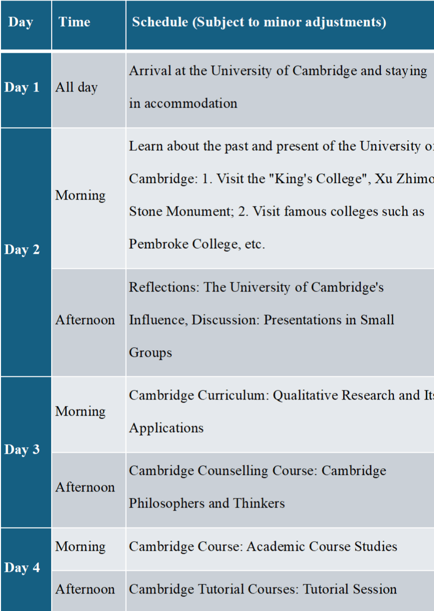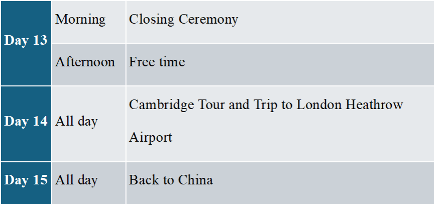 项目费用:英镑4286/人。(含伦敦落地接送机费用,剑桥课程费用、剑桥住宿费用、高桌晚宴Formal Hall,赴伦敦和牛津参观旅费。不含机票、餐饮等费用)。