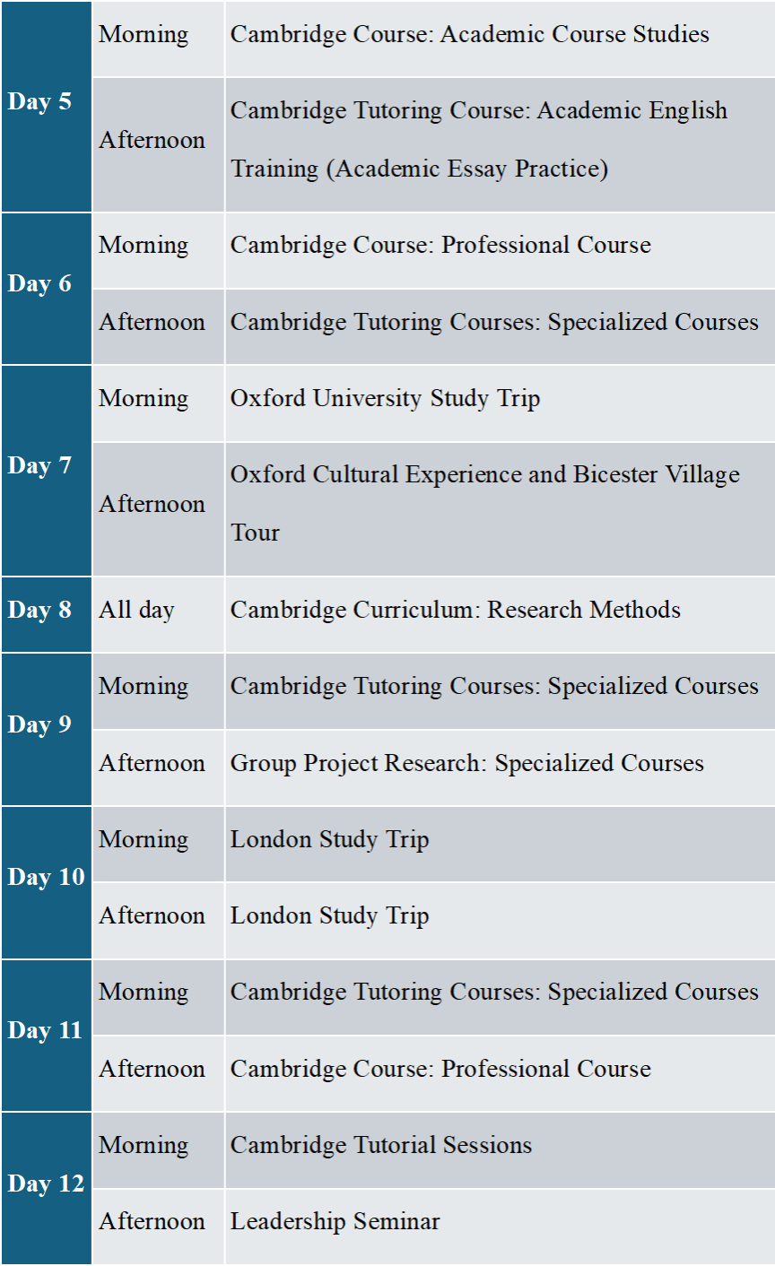 项目主要由课堂教学和现场参访两部分构成:课堂教学由剑桥大学教授担纲课程设计、讲授、辅导与点评;现场教学为赴伦敦和牛津参访等。通过参加该项目,学生将切实感受剑桥大学的优美环境、悠久历史与浓厚的学术氛围。课程结束后可获得剑桥教育与研究中心颁发的由剑桥大学授课老师签名的项目课程证书。